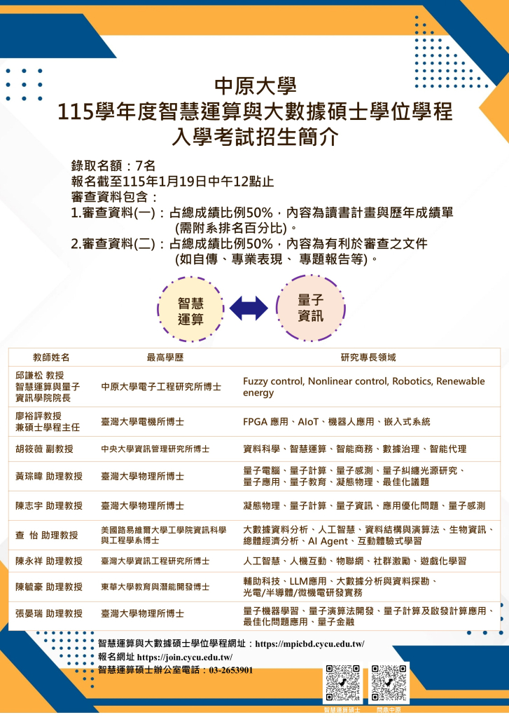 718642025-12-30 11:10:232025-12-30 11:10:23115學年度智慧運算與大數據碩士學位學程 入學考試招生簡介